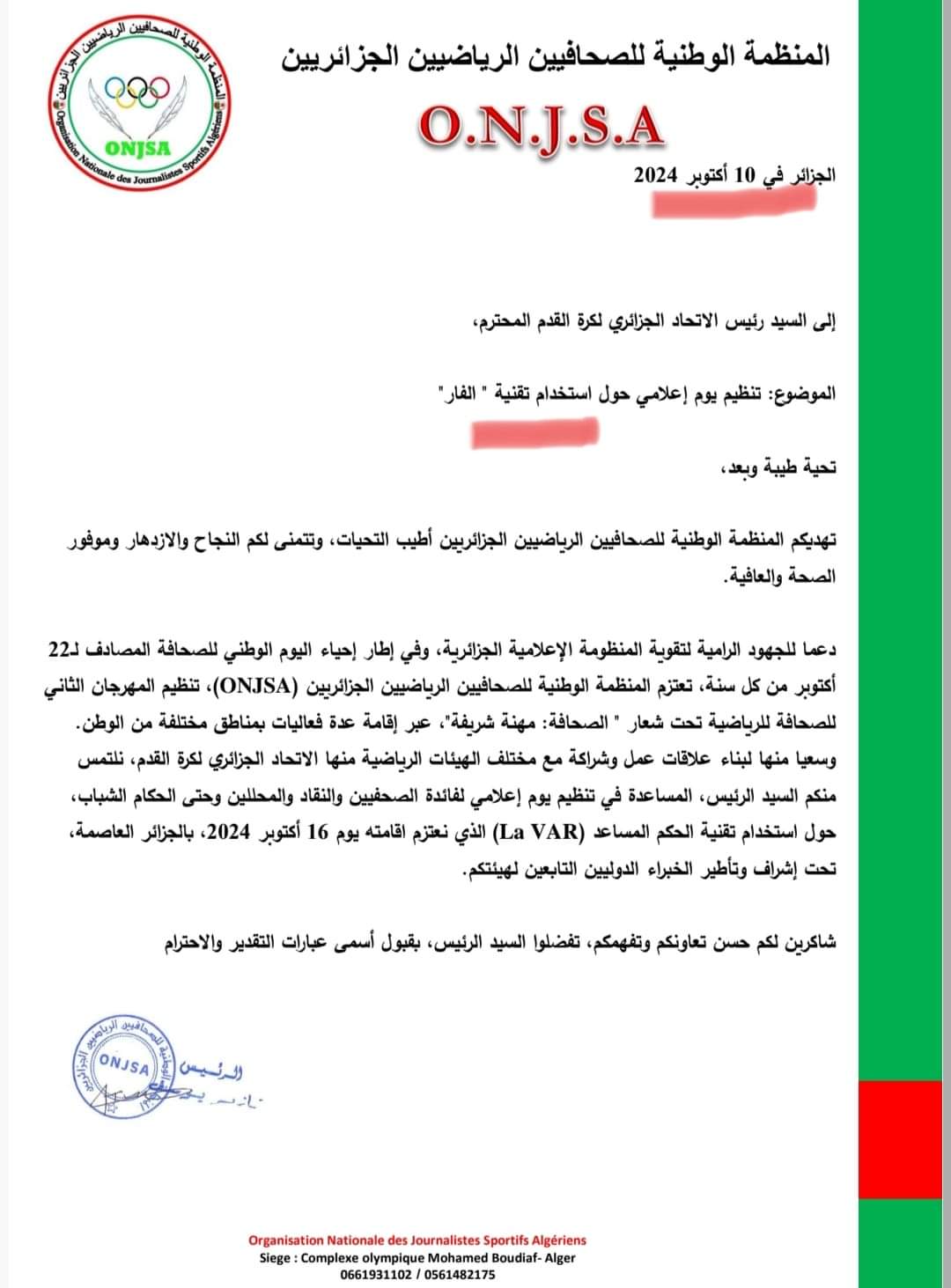 وكشفت المنظمة الوطنية للصحفيين الرياضيين الجزائريين أنها في الوقت الذي كانت تنتظر ردا من الاتحادية الجزائرية لكرة القدم، بخصوص طلبها بتخصيص يوم إعلامي حول استخدام تقنية “الفار”، بالشراكة، بعد أن سبق مكتب المنظمة التنفيذي أن تقدم بالفكرة، بتاريخ 7 أكتوبر الماضي.