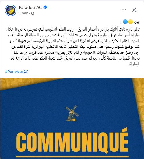 وقالت إدارة بارادو: “تعلم ادارة نادي أتلتيك بارادو، أنصار الفريق. وبعد الظلم التحكيمي الذي تعرض له فريقنا خلال مباراة أمس أمام فريق مولودية وهران… أنه تم التنديد بالظلم التحكيمي الذي تعرض له فريقنا من طرف حكم المباراة الرئيسي “س.عوينة “.