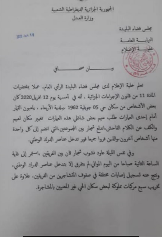 أصدر النائب العام بمجلس قضاء البليدة اليوم الخميس بيانا يوضح فيه وقائع أحداث مدينة الاربعاء بذات الولاية.