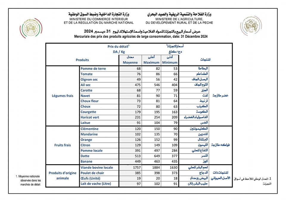 وجاء في صفحة الوزارة على فايسبوك، عرض أسعار البيع بالتجزئة للمواد الفلاحية واسعة الاستهلاك لليوم الثلاثاء 31 ديسمبر 2024.