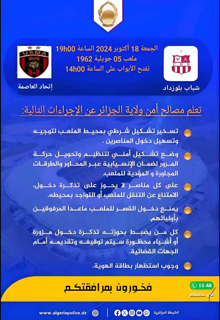 ونشرت مصالح أمن العاصمة، بيان، تضمن جملة من الاجراءات الأمنية التي سيتم اتباعها لضمان سير هذه المبارة في أفضل الظروف.