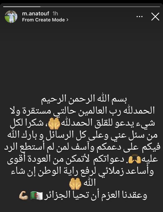 كما حرص لاعب المنتخب الوطني لأقل من 17 عاما، على توجيه شكر خاص لكل من سأل عنه خلال الفترة، مؤكدا عزمه على العودة بقوة لتشريف الراية الوطنية.