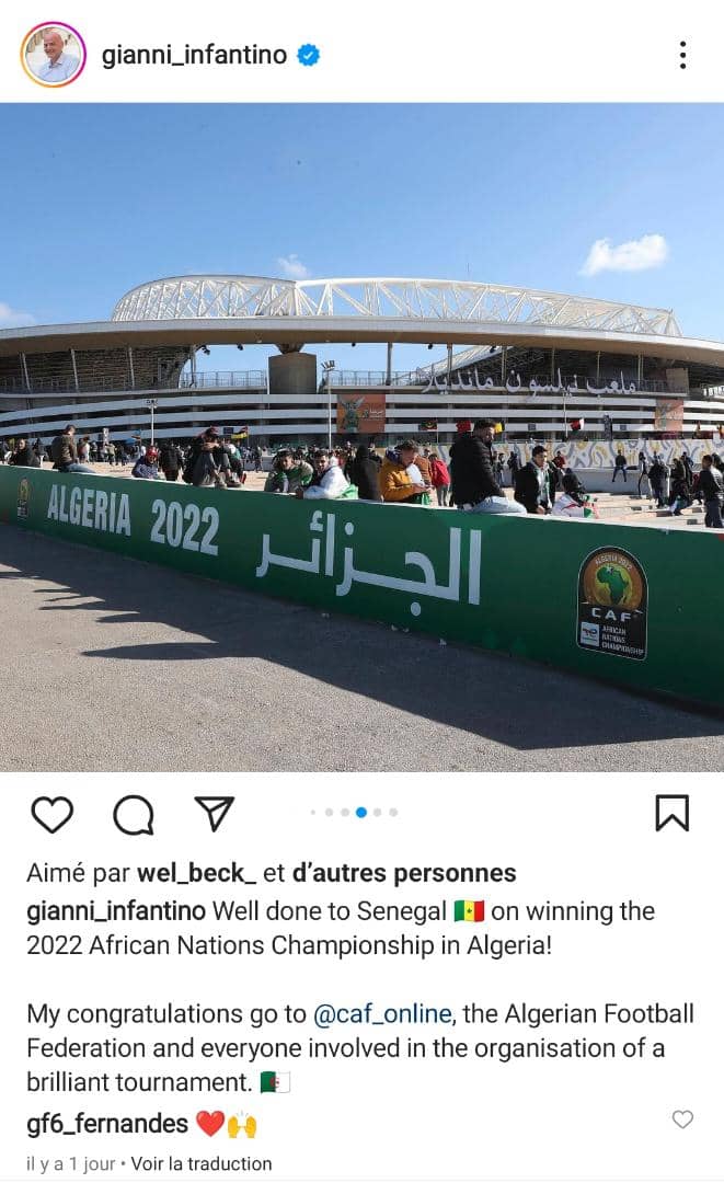 ونشر أمس الأحد، رئيس الفيفا جياني أنفانتينو، عبر حسابه الرسمي على “الأنستغرام”، رسالة هنأ فيها المنتخب السنغالي المُتوج ببطولة كأس إفريقيا للمحليين “الشان”.