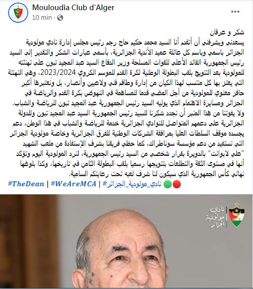 وتقدم رئيس المولودية حكيم حاج رجم، باسمه وباسم كل عائلة عميد الأندية الجزائرية. بأسمى عبارات الشكر والتقدير إلى رئيس الجمهورية القائد الأعلى للقوات المسلحة وزير الدفاع عبد المجيد تبون. على تهنئته للمولودية بعد التتويج بلقب البطولة الوطنية لكرة القدم للموسم الكروي 2023/2024″.