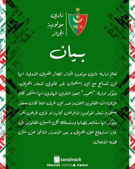 ندّدت إدارة مولودية الجزائر بالاستعمال غير القانوني لشعار النادي، وتؤكد أنّها لن تتسامح مع أي استعمال يضر بصورة الفريق.