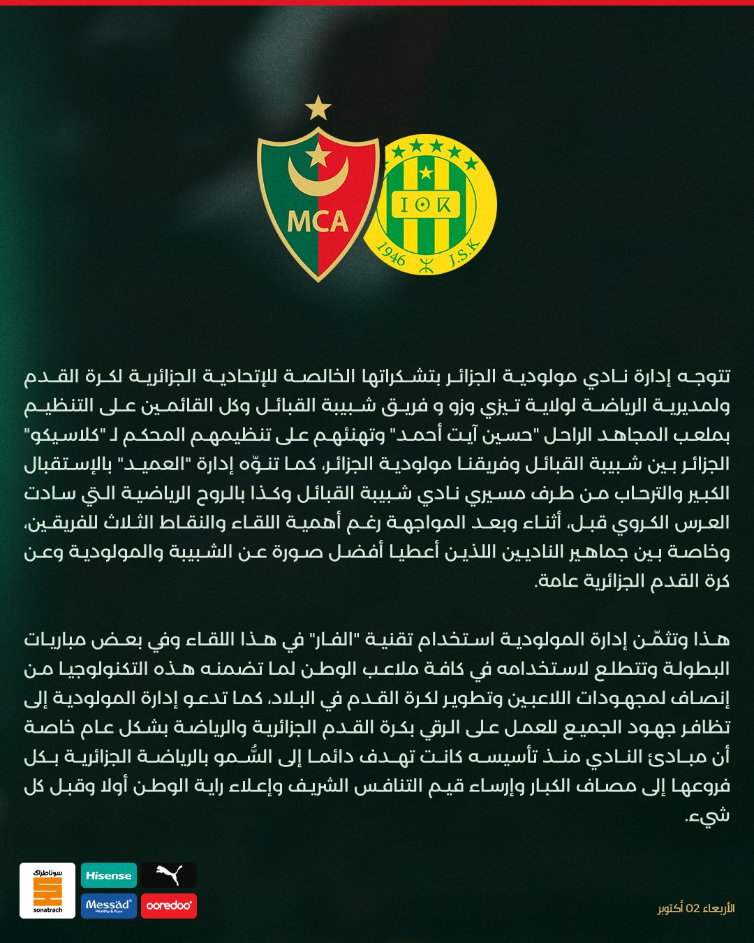 ونشرت إدارة المولودية رسالة مطولة عبر صفحتها الرسمية وجهت من خلالها الشكر للاتحاد الجزائري لكرة القدم، ومديرية الشباب والرياضة لولاية تيزي وزو.