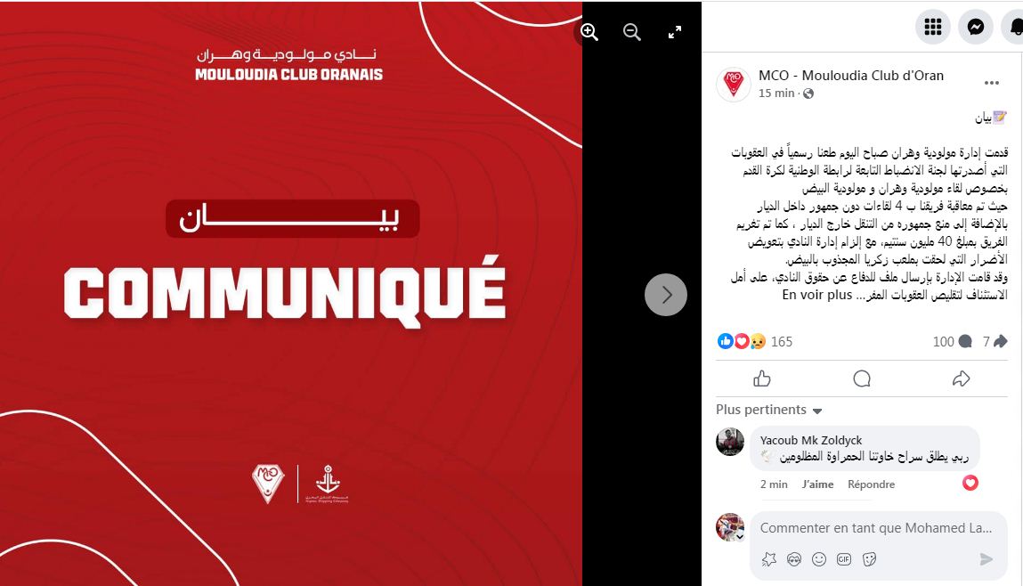 وأوضحت إدارة المولودية الوهرانية، بأنها قامت بإرسال ملف للدفاع عن حقوق النادي. على أمل الاستئناف لتقليص العقوبات المفروضة على فريقها.