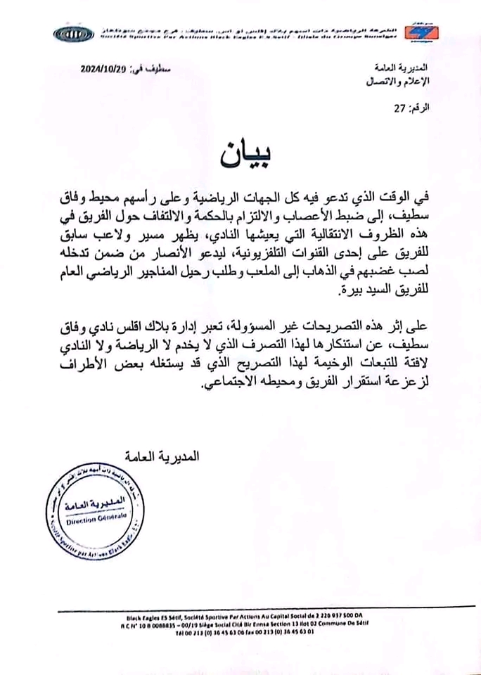 ونشرت إدارة وفاق سطيف، اليوم الثلاثاء، بيانا عبر صفحة الفريق الرسمية على منصة فيسبوك جاء على النحو التالي: “في الوقت الذي تدعو فيه كل الجهات الرياضية وعلى رأسهم محيط وفاق سطيف، إلى ضبط الأعصاب والالتزام بالحكمة والالتفاف حول الفريق في هذه الظروف الانتقالية التي يمر بها الفريق. يظهر مسير ولاعب سابق للفريق. على إحدى القنوات التلفزيونية ليدعو الأنصار، من ضمن تدخله، لصب غضبهم في الذهاب إلى الملعب وطلب رحيل المناجير الرياضي العام للفريق، السيد بيرة”.