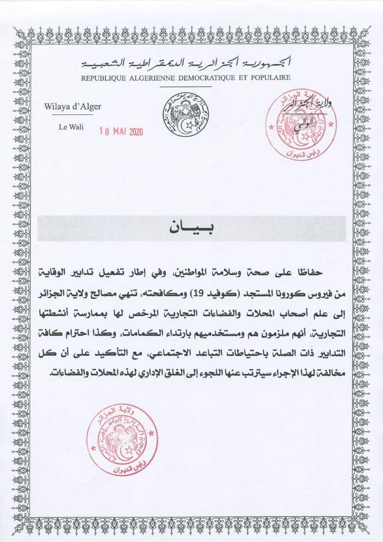 تنهي مصالح ولاية الجزائر إلى علم أصحاب المحلات والفضاءات التجارية المرخص لها بممارسة نشاطها، أنهم ملزمون هم ومستخدميهم بارتداء الكمامات.