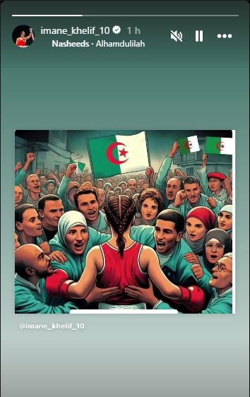 و قالت إيمان خليف في ذات المنشور “الحمد لله” في إشارة إلى المساندة والحب الكبير الذي منحه لها الشعب الجزائري خلال منازلتها المجرية لوكا ماهوري و الفوز عليها. لتضمن بذلك ميدالية للجزائر في ألعاب باريس.