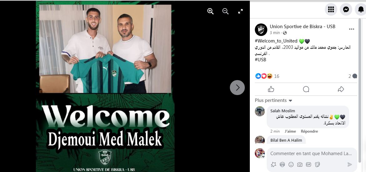 أعلنت إدارة اتحاد بسكرة، اليوم الأحد، رسميا عن تعاقدها مع الحارس الشاب، جموي محمد مالك.