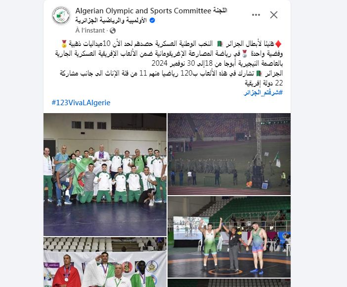 وهنّأت اللجنة الأولمبية والرياضية الجزائرية، النخب الوطنية العسكرية. على حصدهم إلى حد الآن 10 ميداليات ذهبية وفضية واحدة، في رياضة المصارعة الإغريقومانية.