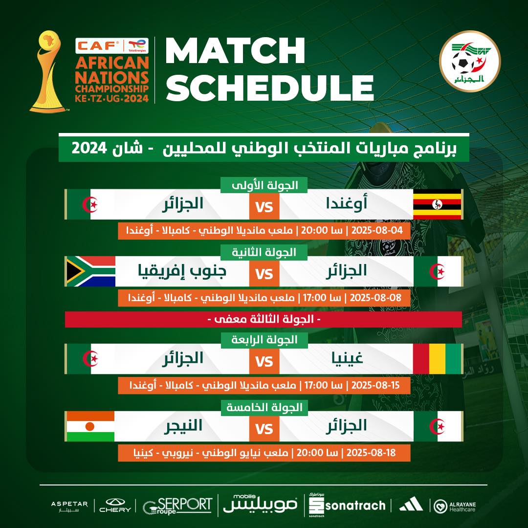 ويدخل أشبال الناخب، مجيد بوقرة، هذا التحدي القاري بطموحات كبيرة، في مجموعة قوية، إذ يستهل “الخُضر” المشوار بمواجهة منتخب أوغندا يوم 4 أوت على الساعة 20:00 بملعب مانديلا الوطني في العاصمة كامبالا. ثم يواجهون منتخب جنوب إفريقيا يوم 8 أوت على الساعة 17:00 في نفس الملعب.