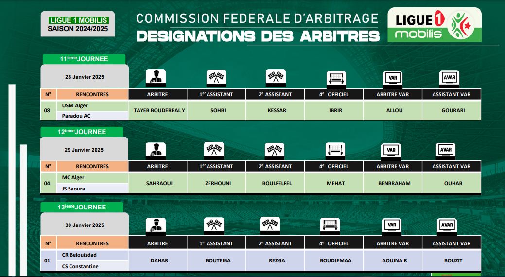 وعيّنت ذات اللجنة، الثلاثي طيب بودربالي، وصحبي وكسار، لإدارة لقاء يوم غدٍ الثلاثاء، بين اتحاد العاصمة وأتليتيك بارادو، ضمن تسوية الجولة الـ 11. فيما سيقود “الفار” الحكم علو، بمساعدة قوراري.