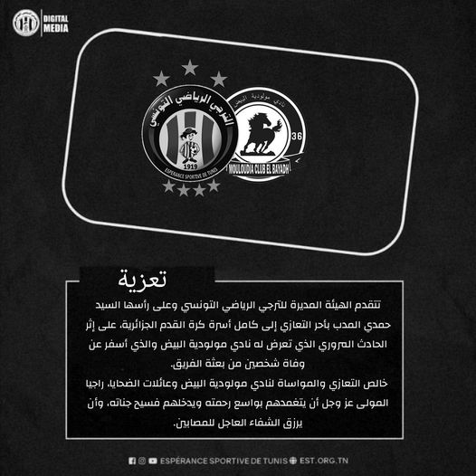 وختمت إدارة العريق التونسي “خالص التعازي و المواساة لنادي مولودية البيض وعائلات الضحايا راجيا المولى عز و جل أن يتغمدهم بواسعة رحمته ويدخلهم فسيح الجنان”.