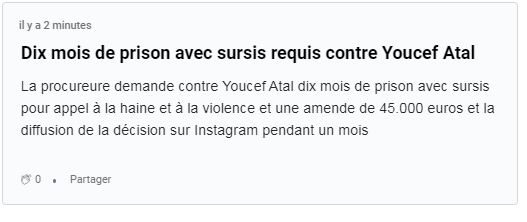 وحسبما جاء في صحيفة “نيس ماتان” الفرنسية. فقد طالبت وكيل الجمهورية لمحكمة نيس، بسجن عطال، لـ 10 أشهر غير نافذة، بتهمة التحريض على العنف والكراهية.