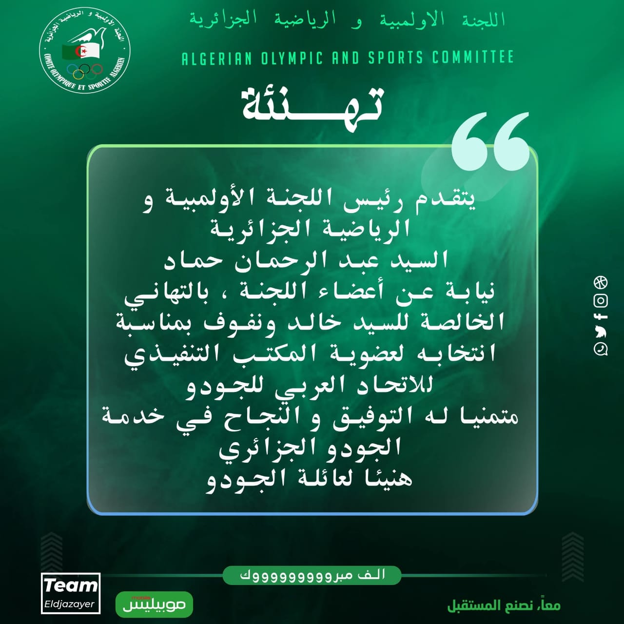 ومن جهته، تقدم رئيس اللجنة الأولمبية والرياضية الجزائرية عبد الرحمن حماد، بتهانيه إلى خالد ونفوف بمناسبة انتخابه لعضوية المكتب التنفيذي للاتحاد العربي لـ”الجيدو”. متمنيا له التوفيق والنجاح في خدمة هذه الرياضة على الصعيد العربي والجزائري.