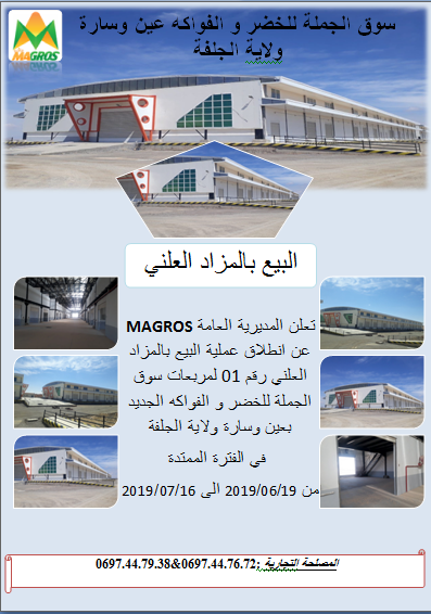 الجديد للخضر والفواكه بعين وسارة ولاية الجلفة، حيث أبلغت المؤسسة الراغبين بالمشاركة، أن عملية المزاد العلني رقم 01/2019 انطلقت