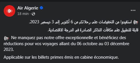 وأشارت الجوية الجزائرية في منشور لها على صفحتها الرسمية بموقع التواصل الاجتماعي فيسبوك أن العرض مستمر إلى غاية 3 ديسمبر.
