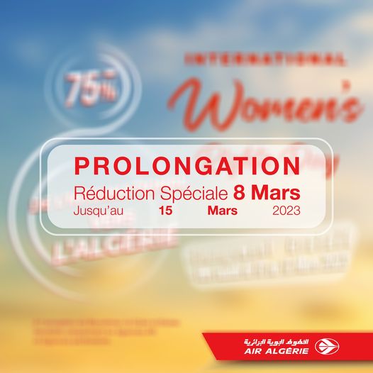 وجاء في البيان:” من أجل تلبية الطلب المرتفع من طرف عملائنا، يسر الخطوط الجوية الجزائرية أن تعلن عن تمديد التخفيض الخاص ب “8 مارس” الى غاية 15 مارس 2023 بنفس الشروط.”