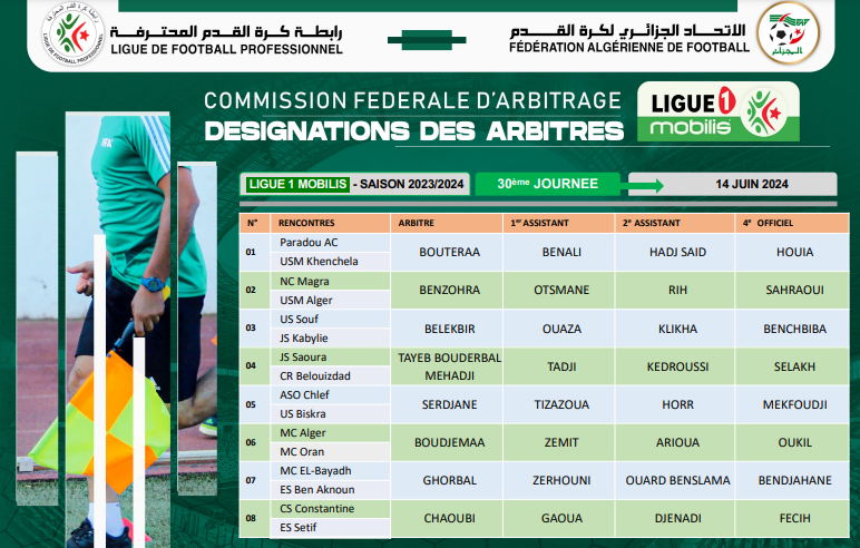 وللإشارة، جاءت باقي تعيينات حكام الجولة 30 من الرابطة المحترفة، على النحو التالي: