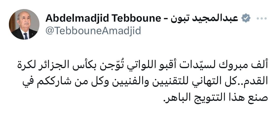 وقال رئيس الجمهورية عبر الصفحة الرسمية على موقع التواصل الاجتماعي “فايسبوك”:”ألف مبروك لسيدات اللواتي توجن بكأس الجزائر لكرة القدم .. كل التهاني للتقنيين و الفنيين وكل من شارككم في صنع هذا التتويج الباهر”.