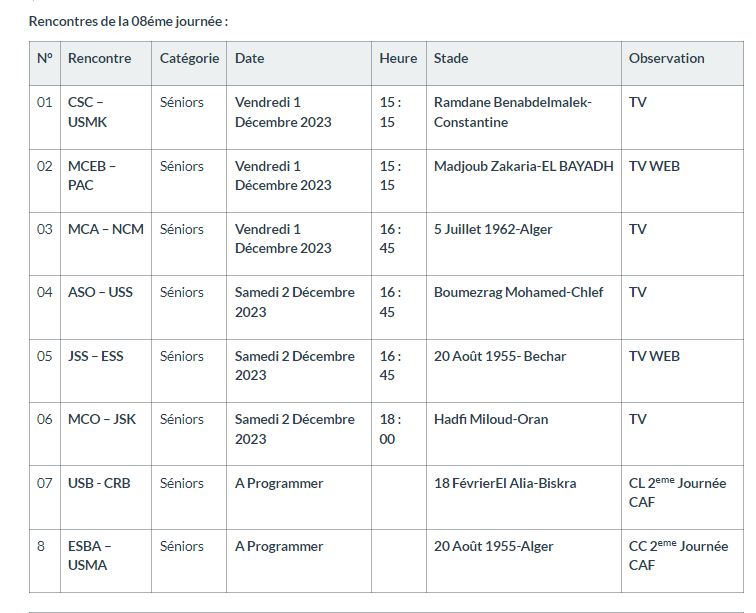 وستكون الجولة الـ 8، مبتورة من لقاءين أطرافها معنية بالمشاركة القارية. ويتعلق الأمر بكل من شباب بلوزداد أمام اتحاد بسكرة، واتحاد العاصمة أمام نجم بن عكنون.