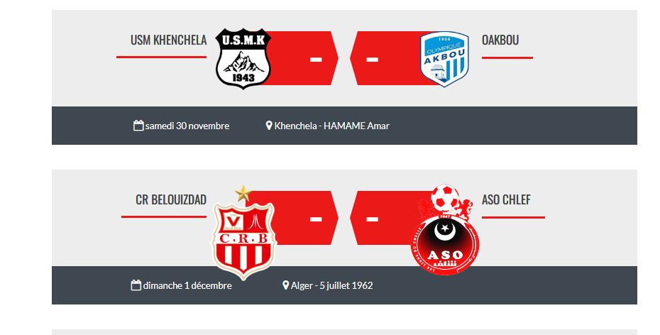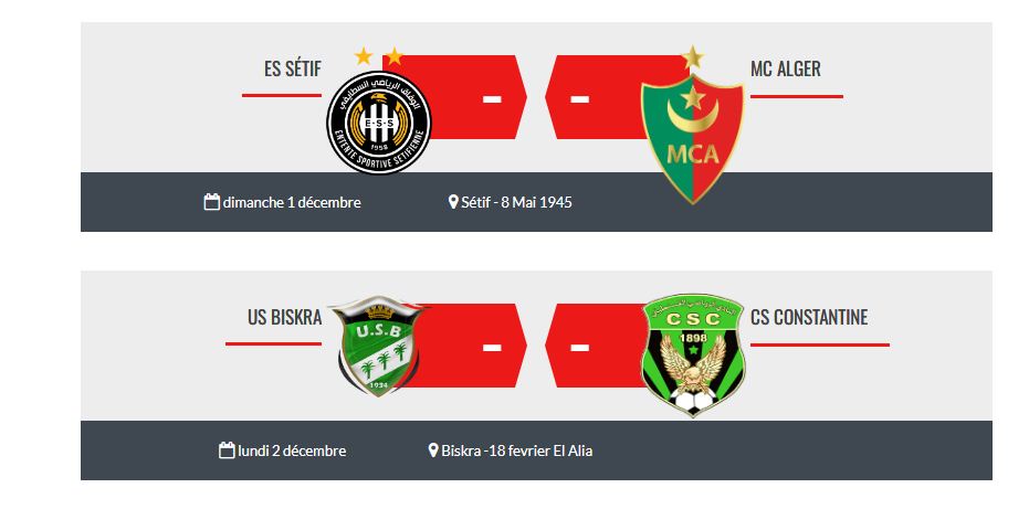 بينما ستلعب يوم الأحد القادم، الـ 1 ديسمبر الداخل، مواجهتين أطرافها معنية بتمثيل الجزائر في دوري أبطال إفريقيا. وتجمع الأولى بين شباب بلوزداد وضيفه أولمبي الشلف. فيما تجمع الثانية بين مولودية الجزائر والمضيف وفاق سطيف.