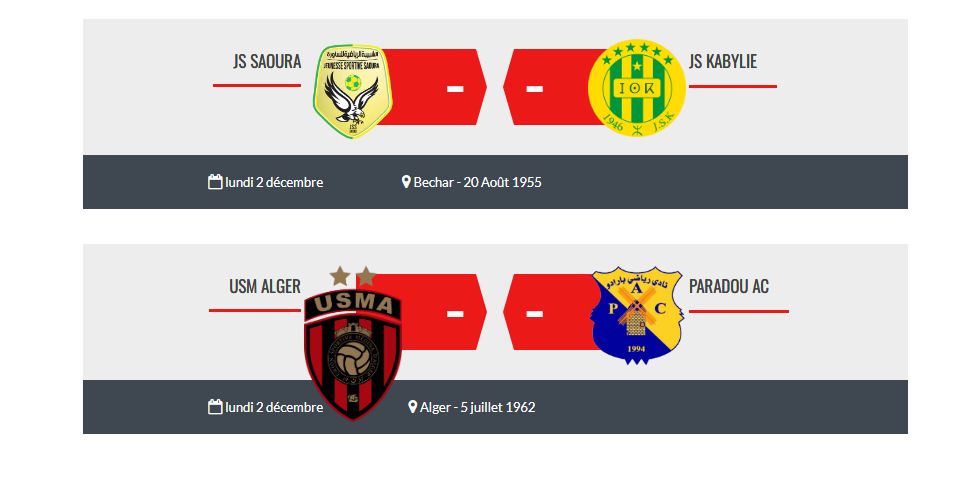 في حين ستلعب يوم الاثنين الـ 2 ديسمبر 3 لقاءات، منها مواجهتين لممثلا الجزائر في كأس “الكاف” اتحاد العاصمة وشباب قسنطينة. أمام كل من أتليتيك بارادو واتحاد بسكرة، على التوالي. بينما يجمع اللقاء الثالث شبيبة الساورة وشبيبة القبائل.