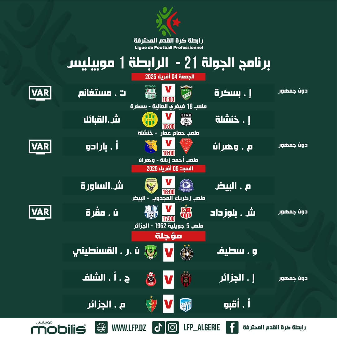 وحسب الصفحة الرسمية للرابطة المحترفة، ستلعب مباريات هذه الجولة الـ21، يومي 4، و5 من هر أفريل الداخل.