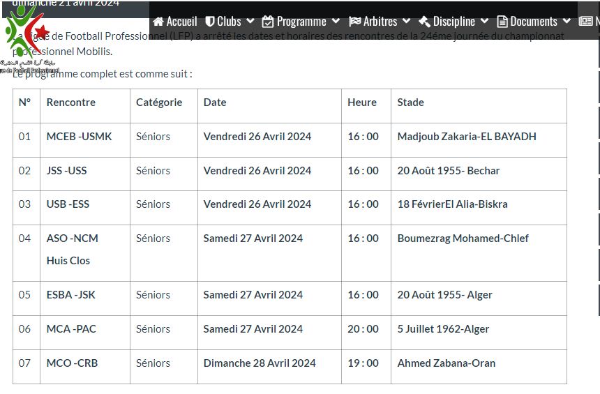 وستلعب يوم الجمعة 26 أفريل الجاري، 3 لقاءات ويتعلق الأمر بمواجهة مولودية البيض واتحاد خنشلة. وشبيبة الساورة أمام الاتحاد السوفي، إلى جانب مباراة اتحاد بسكرة وضيفه وفاق سطيف.
