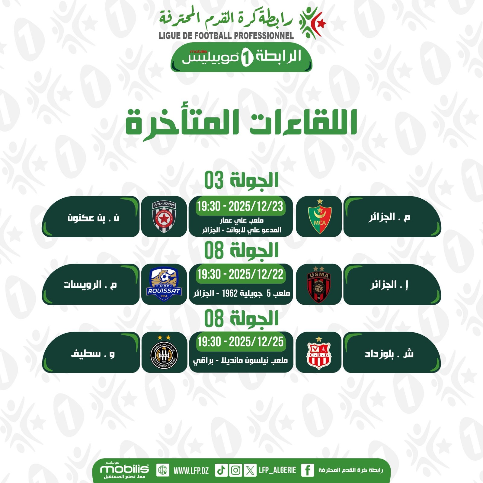 وستُلعب مباراة أخرى متأخرة عن الجولة ذاتها، يوم 25 ديسمبر 2025، تجمع شباب بلوزداد بنادي وفاق سطيف، بملعب نيلسون مانديلا ببراقي، على الساعة 19:30.