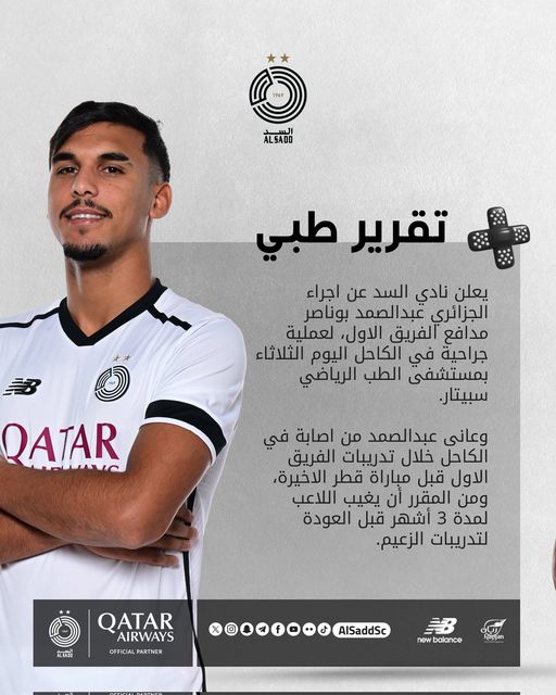 وكشفت إدارة السد القطري، عن مدرب غياب بوناصر الذي سيصل إلى 3 أشهر كاملة، وهو الذي أصيب في وقت سابق في إحدى الحصص التدريبية.