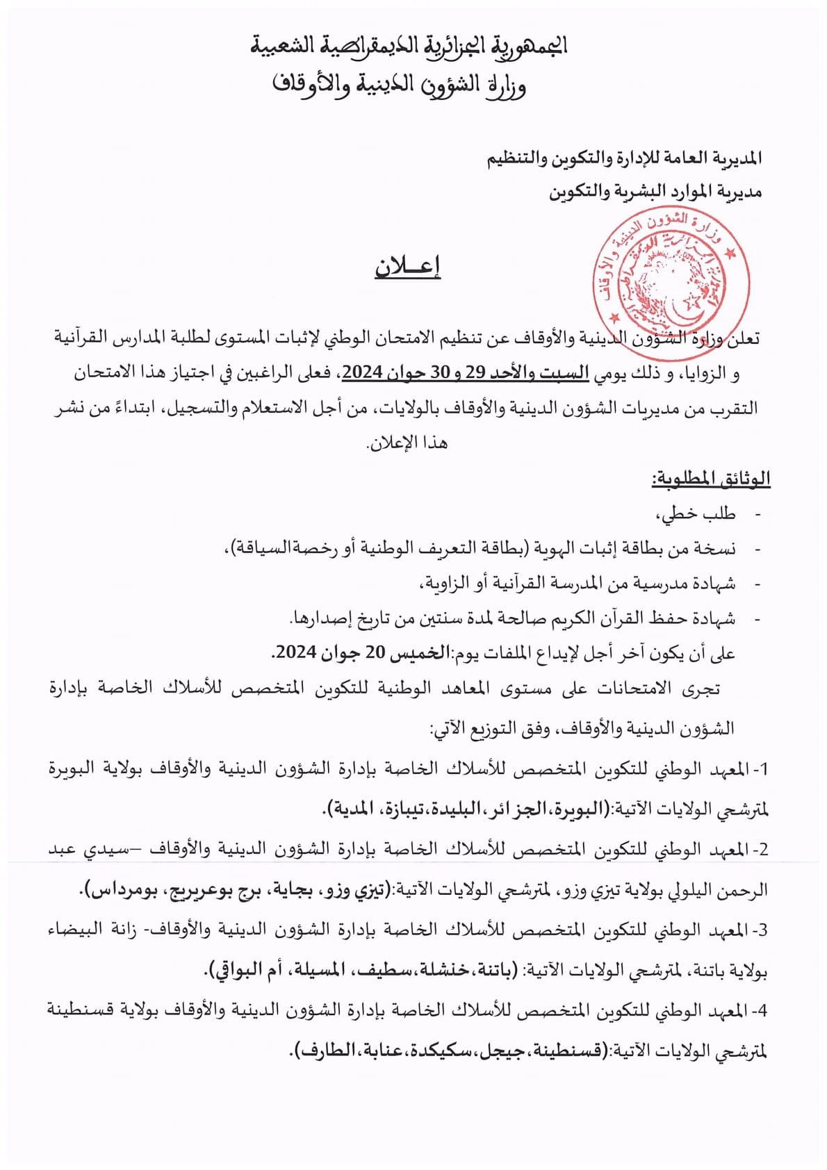 وحسب بيان الوزارة، فإن الامتحان سيكون يومي السبت والأحد 29 و30 جوان. وعلى الراغبين في اجتياز هذا الامتحان التقرب من مديريات الشؤون الدينية والأوقاف بالولايات من أجل الاستعلام والتسجيل.