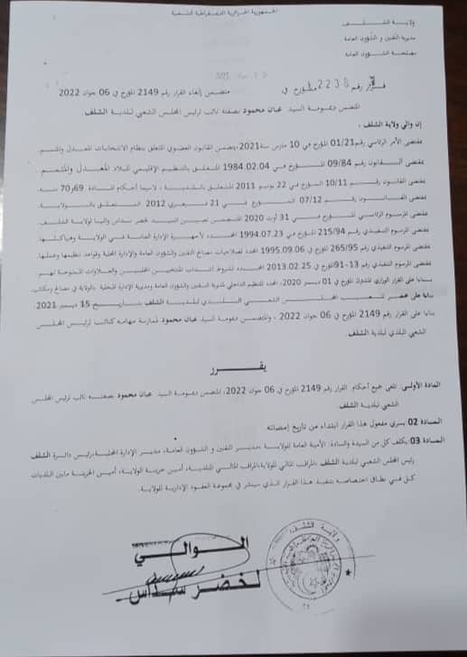 أكدت مصادر محلية مطلعة، بأن والي الشلف لخضر سداس، قد أصدر قرارا تحت رقم 2232/ 22 يتضمن إنهاء ديمومة النائب المدعو عبان محمود المكلف بالإدارة والمالية ببلدية الشلف، وهذا بعد مرور 15 يوما فقط من توقيع ذات المسؤول للقرار 2149 / 22 المتضمن تمتع ذات النائب بأحكام الديمومة.