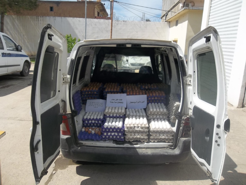 وتمكنت ذات المصالح إثر نقطة مراقبة فجائية بالمدخل الغربي لمدينة بوحجار من توقيف شاحنة ضبط بداخلها كمية معتبرة من مادة البيض كانت موجهة للاستهلاك قدرة الكمية المحجوزة بـ 3900 بيضة.
