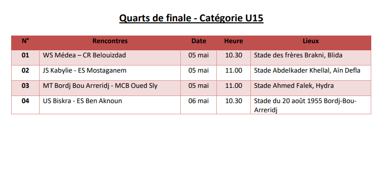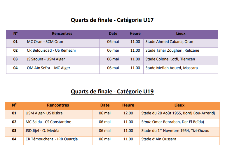 كما قامت ذات اللجنة بتحديد برنامج مباريات الدور الربع نهائي لفئة الشبان، الخاصة بطبعة الموسم الجاري من كأس الجمهورية.