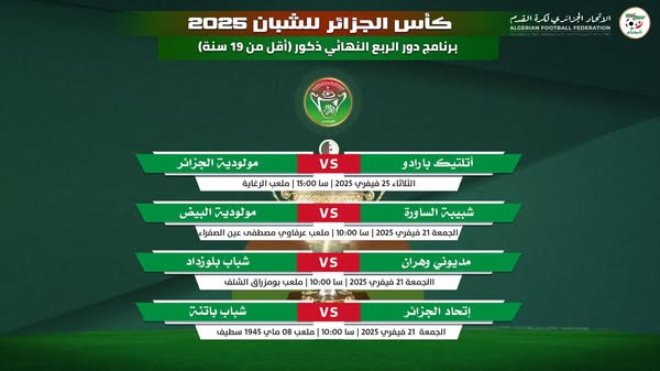 وتتضمن برمجة هذا الدور، مواجهات في القمة، مثل تلك التي سيواجه فيها نادي أتلتيك بارادو ضيفه مولودية الجزائر (فئة أقل من 19 سنة) بملعب الرغاية يوم الثلاثاء 25 فيفري الجاري بداية من الساعة الثالثة (15:00) بعد الزوال.