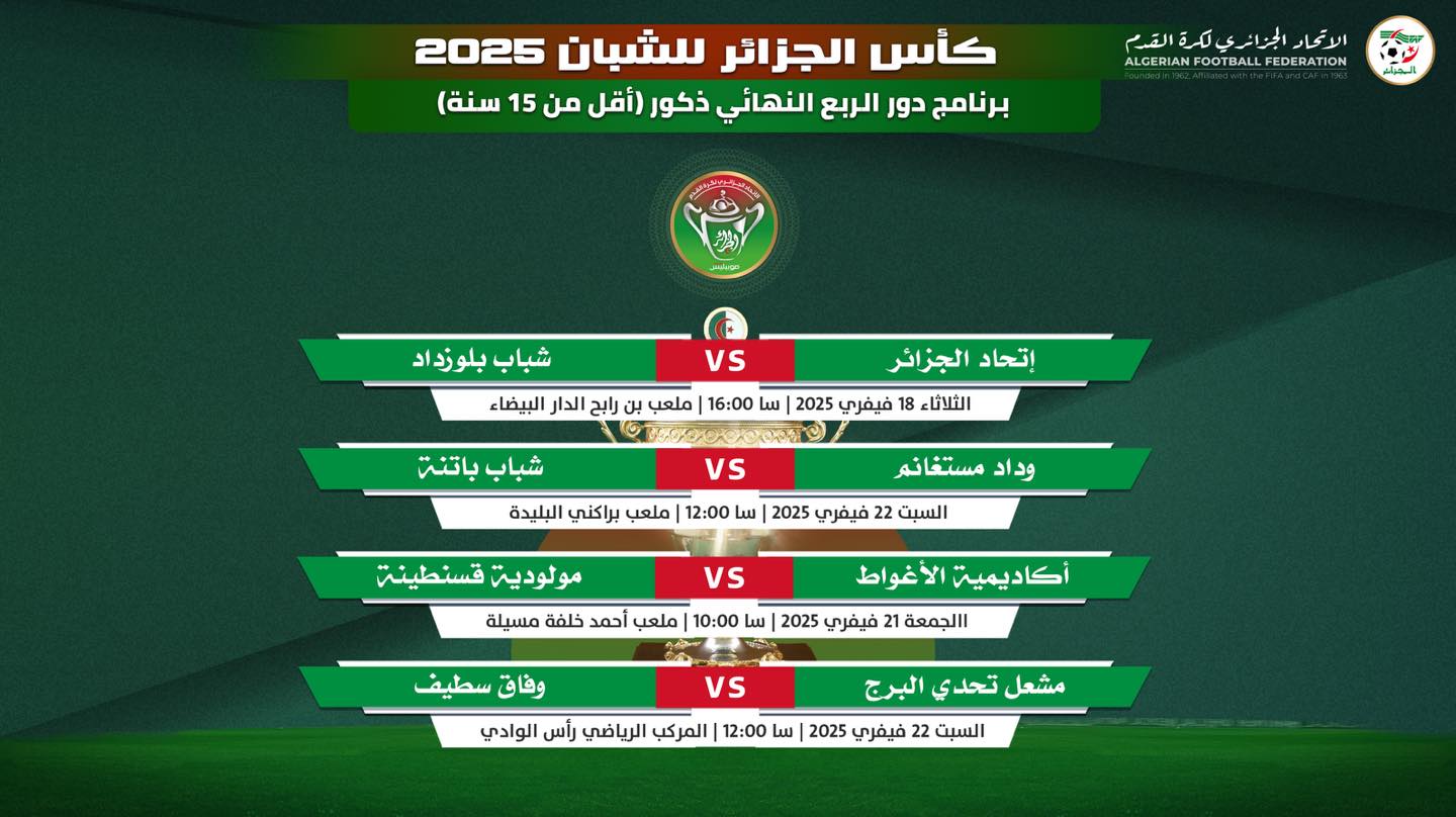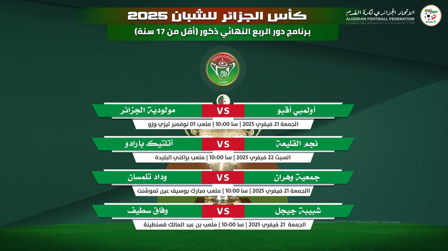 أعلنت الاتحادية الجزائرية لكرة القدم، اليوم الاثنين، عن برنامج مباريات ربع نهائي كأس الجزائر للفئات الشبانية التي ستحمل في طياتها مباريات من العيار الثقيل.