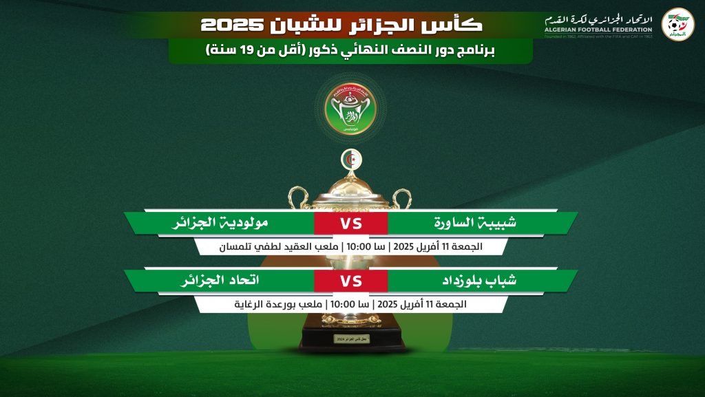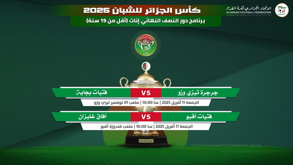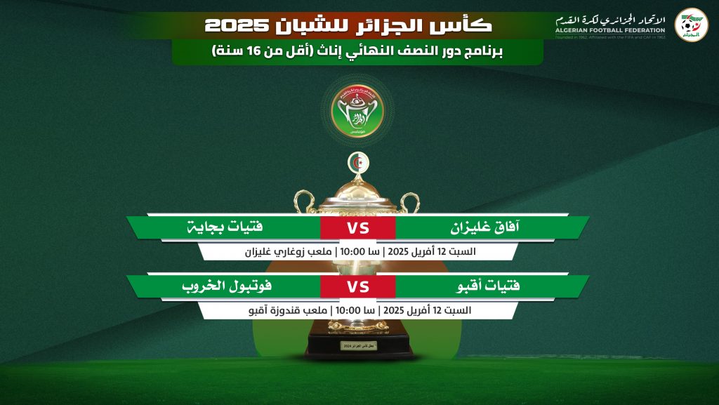 ونشرت “الفاف” عبر موقعها الرسمي، برنامج المباريات الخاصة بالدور النصف نهائي لكأس الجزائر، الخاص بفئتي السيدات، والرجال، للأصناف الشابة.