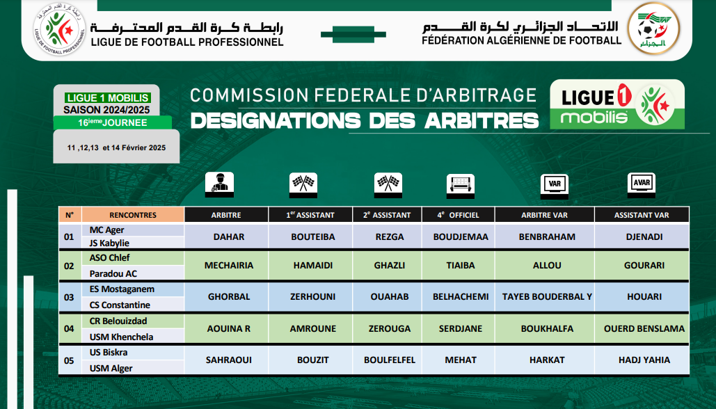 مع اقتراب انطلاق مرحلة العودة من البطولة المحترفة، كشف الاتحاد الجزائري لكرة القدم “الفاف” اليوم الأحد، عن تعيينات حكام الجولة الـ16.