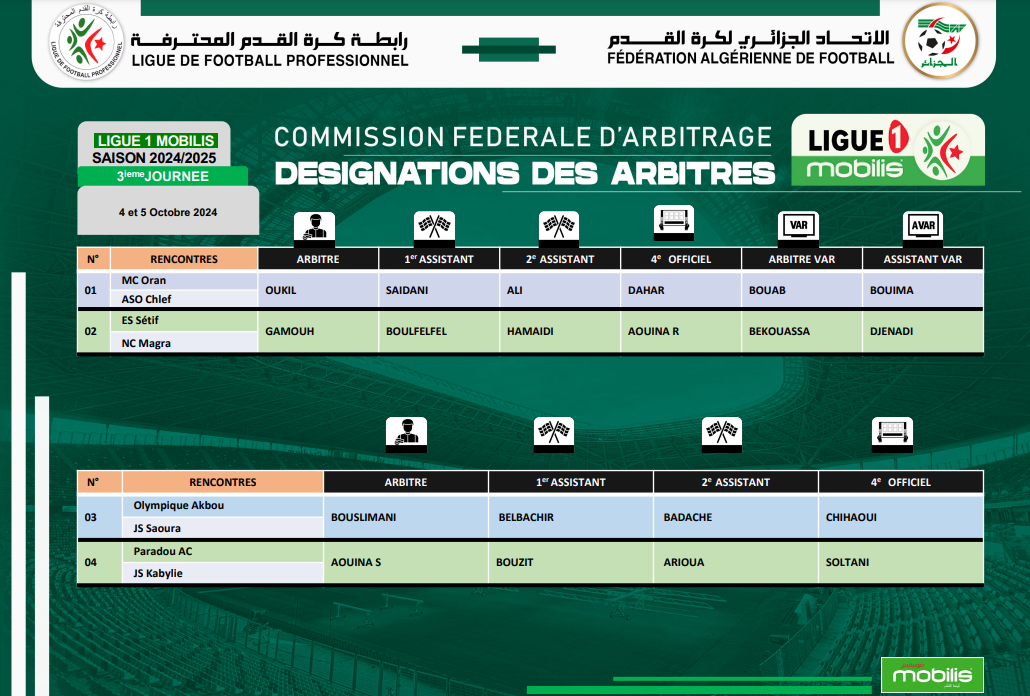 كشف الاتحاد الجزائري لكرة القدم “الفاف”، اليوم الأربعاء، تعيينات حكام مباريات الجولة الثالثة من البطولة المحترفة.