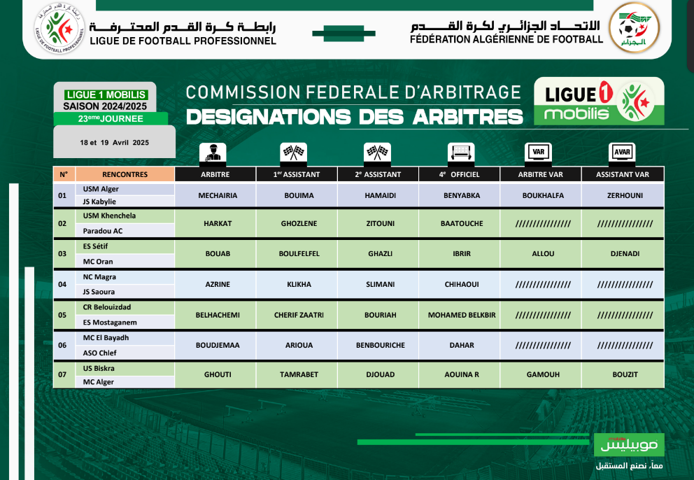 كشف الاتحاد الجزائري لكرة القدم “الفاف”، عن تعيينات الحكام التي أقرّتها لجنة التحكيم، والخاصة بمباريات الجولة الـ23 من البطولة المحترفة.