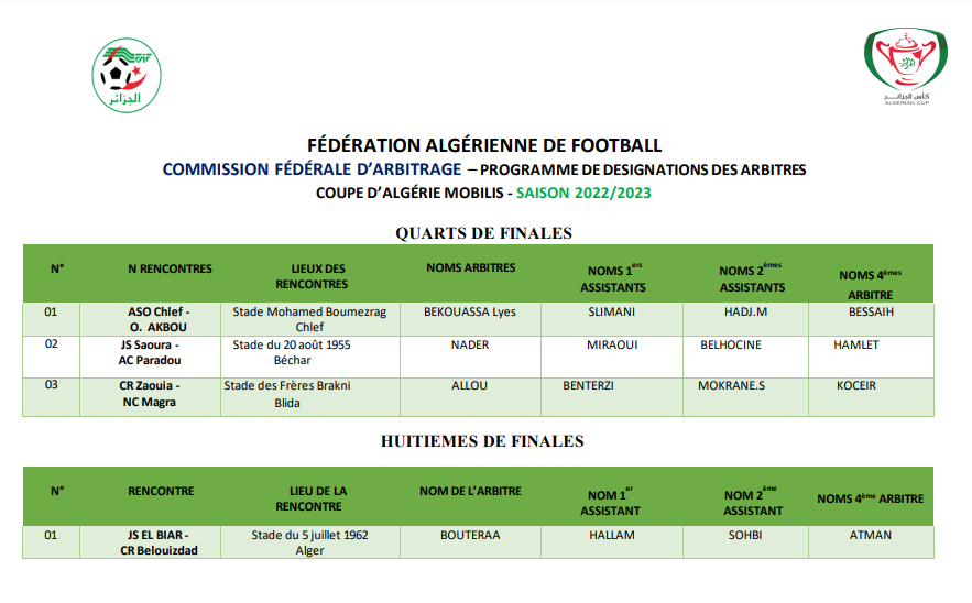 كشف الاتحاد الجزائري لكرة القدم “الفاف” تعيينات حكام مباريات الدور الربع نهائي لمنافسة كأس الجمهورية.