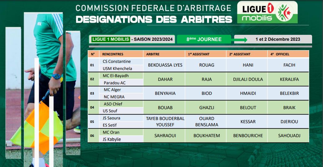كشفت الاتحادية الجزائرية لكرة القدم “فاف” عن قائمة حكام الجولة الـ 8 من البطولة المحترفة، المقرر أن تلعب يومي الجمعة والسبت القادمين.