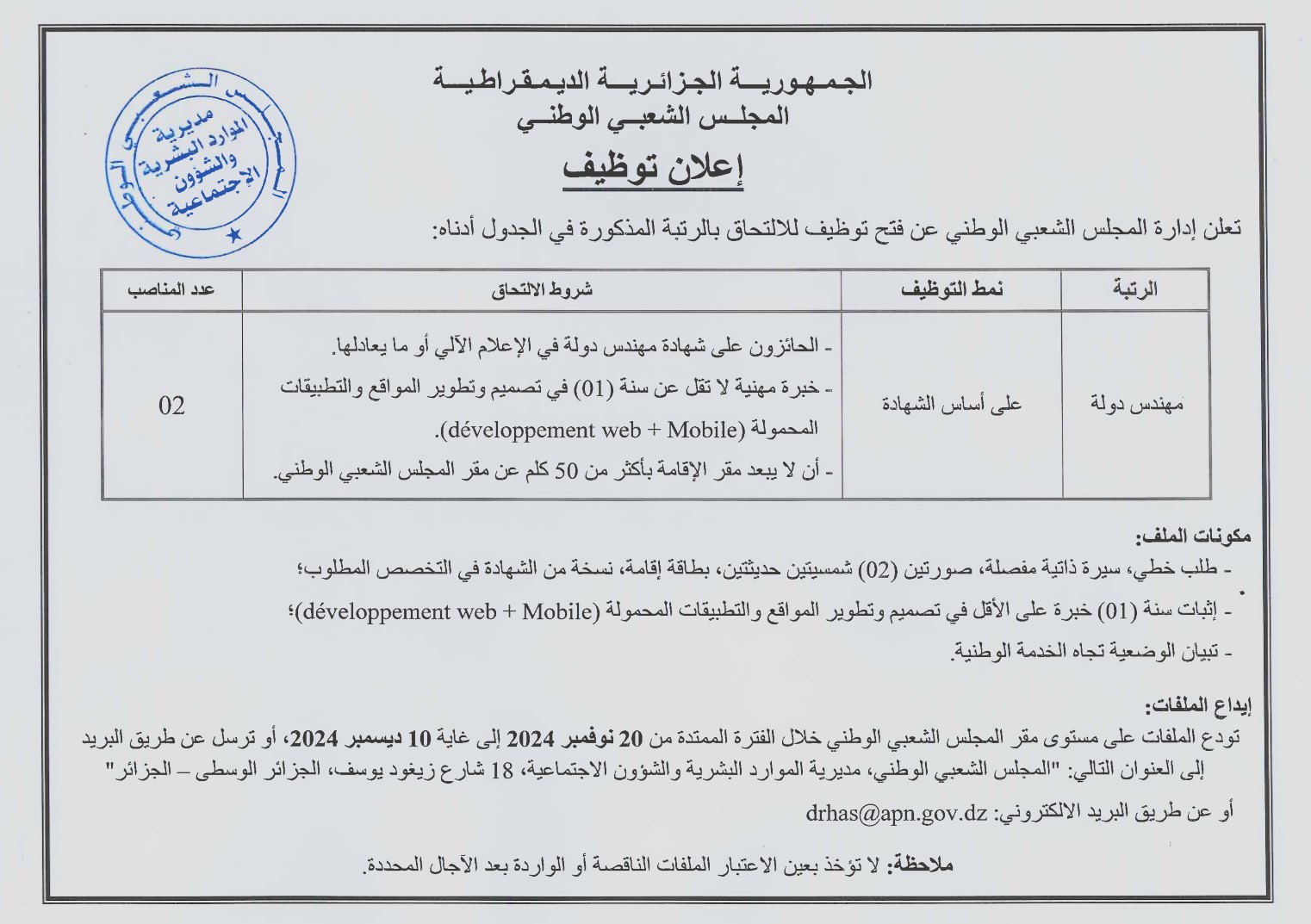 كما ترسل الملفات، عن طريق البريد إلى العنوان التالي: المجلس الشعبي الوطني، مديرية الموارد البشرية والشؤون الاجتماعية، 18 شارع زيغود يوسف الجزائر الوسطى - الجزائر.