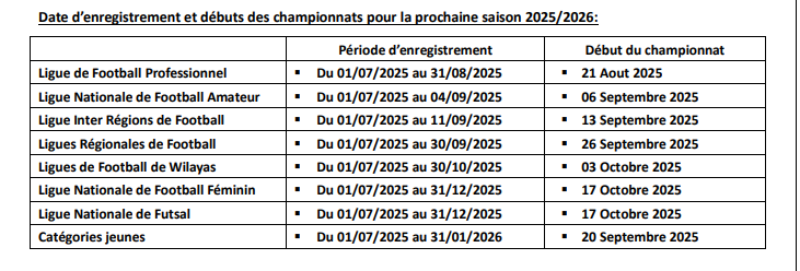 ووفق ما كسفت عنه الموقع الرسمي لـ”الفاف” اليوم الخميس، قرر المكتب الفيدرالي، انطلاق البطولة الخاصة بموسم 2025-2026، بتاريخ 21 أوت 2025.