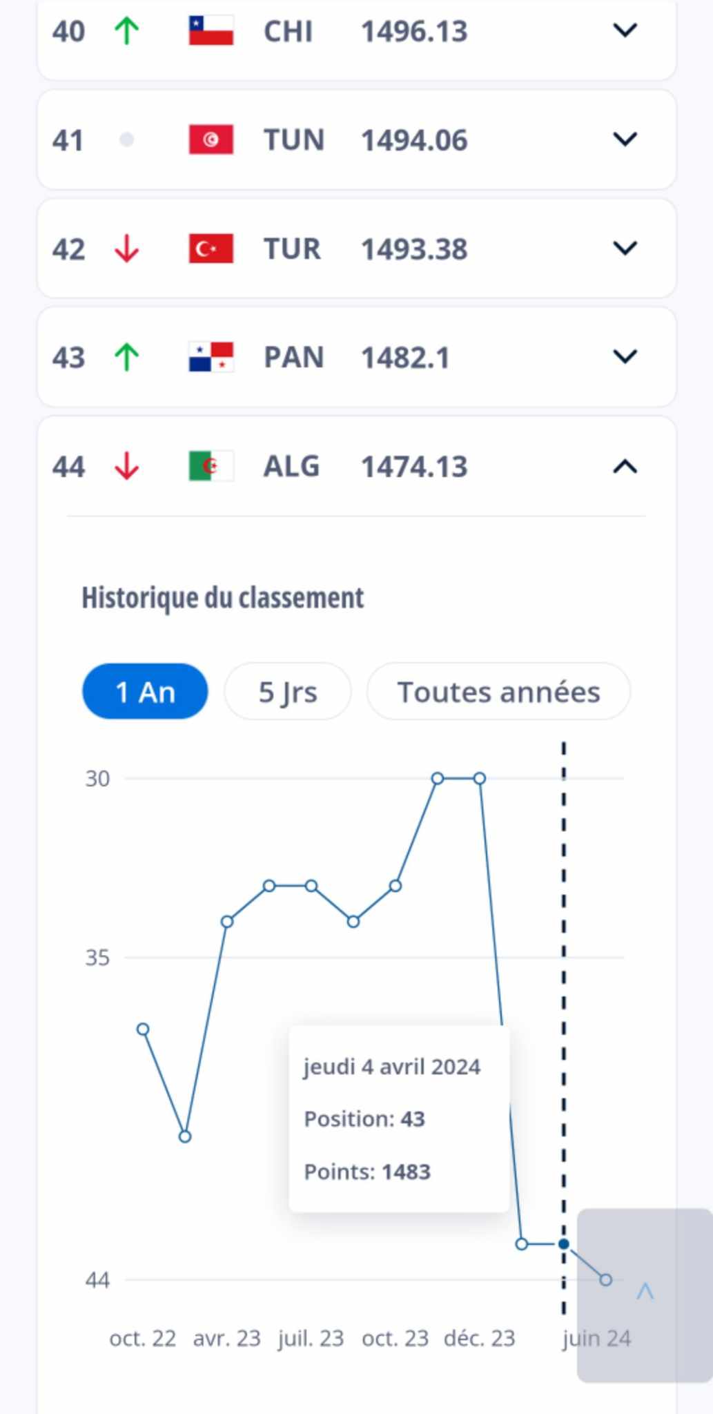 أما على المستوى العربي، فقد جاء المنتخب الوطني في المركز الخامس، خلف كل من المنتخبات: المغرب، قطر، مصر، تونس.