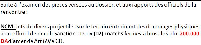 وقررت الهيئة الانضباطية، معاقبة نجم مقرة، بلعب لقاءين من دون جمهور. وغرامة بقيمة 20 مليون سنتيم، بسبب رمي مقذوفات. أصابت أشخاص رسميين في لقاء الفريق أمام الضيف مولودية وهران.