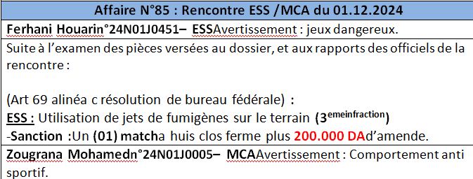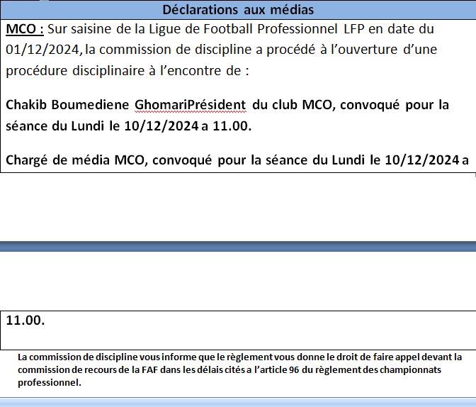 وبخصوص لقاء نجم مقرة ومولودية وهران، فقد تم استدعاء رئيس هذا الأخير، شكيب بومدين، إلى جانب المكلف بالإعلام، إلى مقر الرابطة. الاثنين المقبل 10 ديسمبر الجاري. بداية من الساعة 11:00. للاستماع إلى أقوالهما بسبب التصريحات الإعلامية.